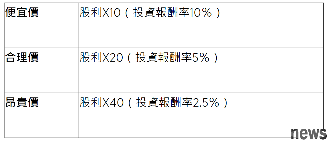 10, 20, and 40 principle: use the capital ratio to calculate the reasonable price for entryto find a good company. The next step is to buy stocks with the good price. How much is a good price? Xie Shiying has a set of stock calculation formulas of "10, 20, 40". A stock, if the dividends pre-allocated in that year are multiplied by the principal amount of 10, 20, and 40, it will result in 3 prices: cheap, reasonable, and expensive. When the price of a stock falls above a reasonable price or even exceeds the expensive price, it is not a good time for stockholders to enter the market (see Table 1).