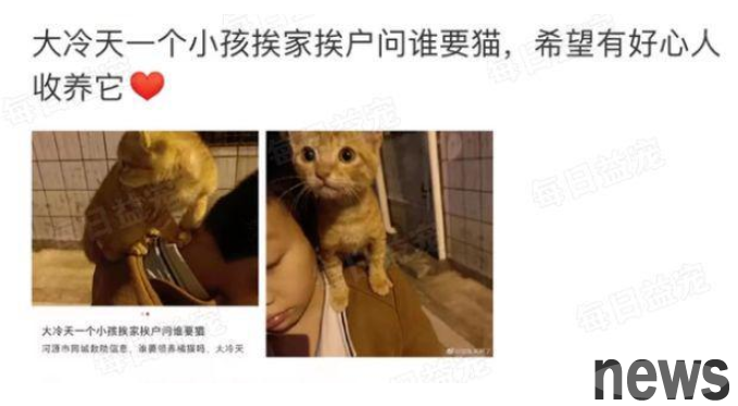 On a cold day, a little boy held an orange cat and knocked on the door from door to door, hoping to find a new home for the cat so that it could spend the winter safely and not become a stray.