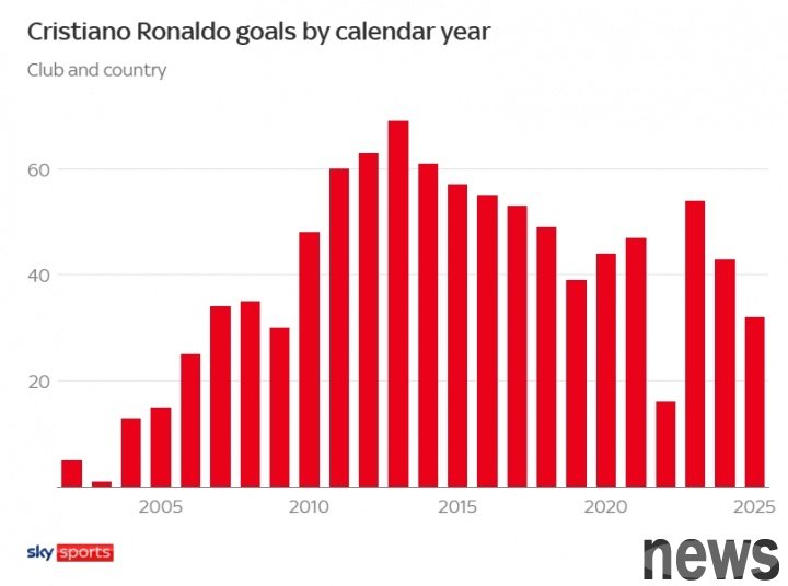 In 2025, Ronaldo has scored 32 goals in club and national team. Since 2010, Ronaldo has averaged more than 50 goals per year. In the past 15 years, his total annual goals have only been less than 39 once. That was in 2022, and he scored 16 goals that year.