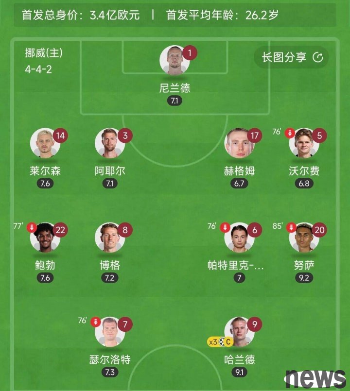 Norway's starting 11 players in this game, the goalkeeper is veteran Nylander, the 35-year-old Norwegian national goalkeeper currently plays for Sevilla. The four defenders are 27-year-old Dortmund defender Leersen, 27-year-old Brentford defender Ayer, 26-year-old Bologna defender Hegem and 23-year-old Wolves star Wolfe. The entire defensive line is made up of players from the five major leagues.