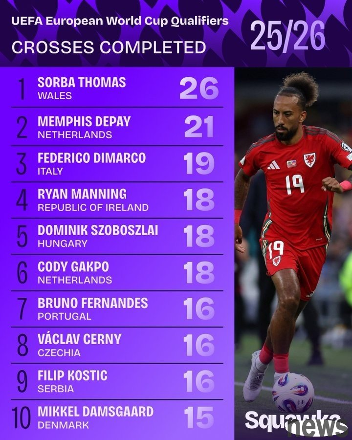 This World European qualifying group stage has come to an end. Squakwa also counted the number of successful crosses in this tournament, with Welsh winger Thorba Thomas leading the way.