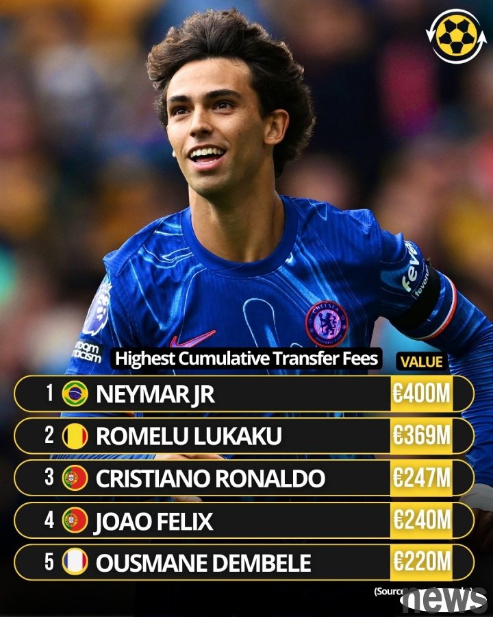 After Felix joined Riyadh to win, his accumulated transfer fee will surpass Dembele in his career and will reach fourth place in history, second only to Neymar, Lukaku and Ronaldo. Special list: 1. Neymar transfers 3 times, cumulative transfer fees...