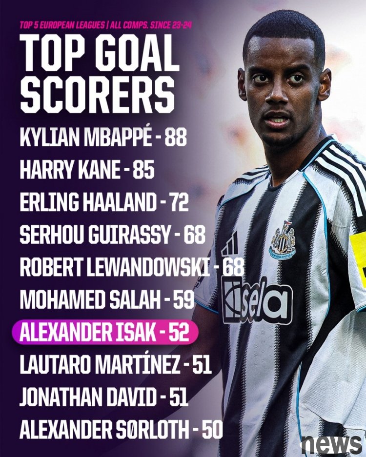 According to Opta statistics, since the 2023-2024 season, Isaac has scored 52 goals in various competitions, with the seventh most players in the five major leagues.